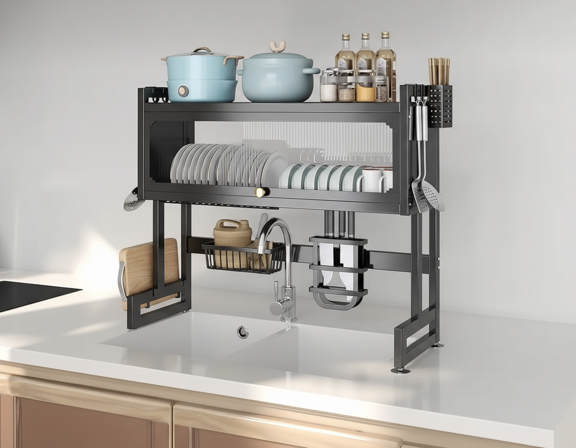 No requiere taladros. Solo debes ajustar las bases sobre la encimera o el fregadero y adaptar la estructura con los tornillos incluidos. Es rápido, firme y seguro.